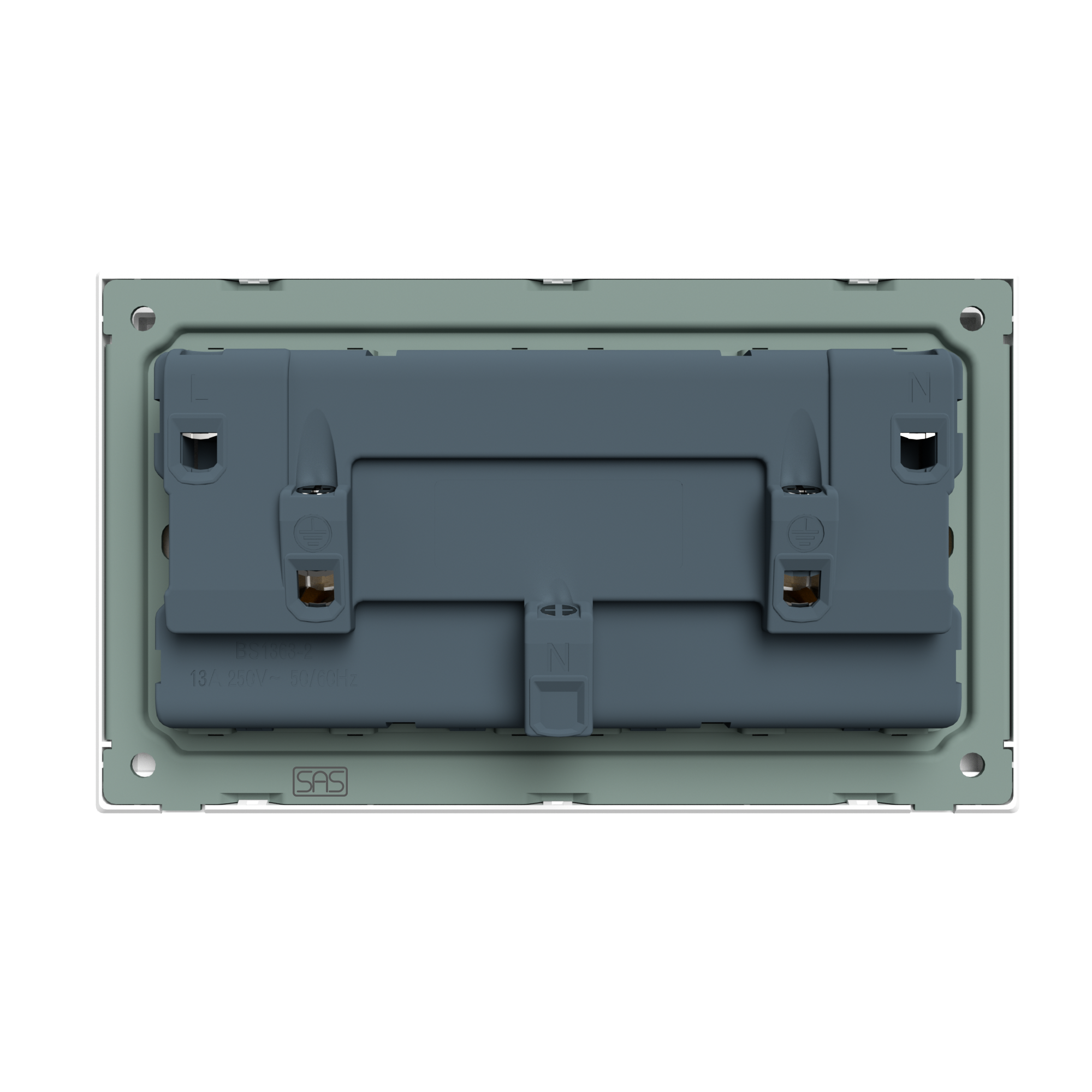 Double switched socket with neon indicators and large rocker design. 13A rated, luxury frameless finish.